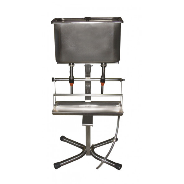 Afvultoestel zonder pomp. Uitvoering, op lage voet, voorzien van zware industriële vulkoppen met automatische stop en regelbare vulhoogte van de flessen. De voorraadbakken zijn uit één stuk gestanst, dus geen lasnaden. Geschikt voor wijn, bier, oliën, detergenten, enz. Volledig RVS, inclusief alle aansluitingen, vlotter en moeren. Stoomsteriliseerbaar. Capaciteit: 130 l / uur per afvulkop ! Met mechanische vlotter in de voorraadbak. Voorzien voor aansluiting op een pomp. 2 bekken Dit toestel is standaard uitgerust met afvulkoppen wijn.