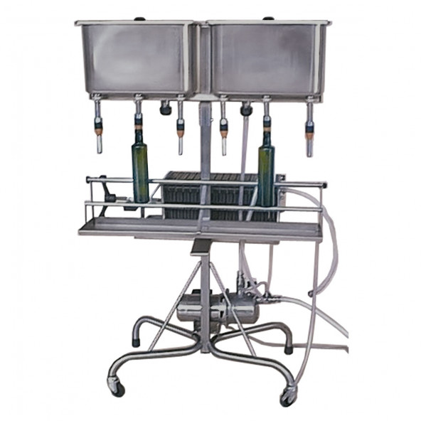 Afvultoestel met elektropomp en 24 volt niveau-controle in de voorraadbakken en met een platenfilter uitgerust. Bij een vol reservoir stopt de pomp. Bij daling van het vloeistofniveau slaat de pomp weer aan. Platenfilter zoals art.nr. 019.035.3, met filterplaten van 20 x 20 cm. Kan ook zonder de platenfilter gebruikt worden. Uitvoering, op voet, voorzien van zware industriële vulkoppen met automatische stop en regelbare vulhoogte van de flessen. De voorraadbakken zijn uit één stuk gestanst, dus geen lasnaden. Geschikt voor wijn, bier, oliën, detergenten, enz. Volledig RVS, inclusief alle aansluitingen, vlotter en moeren. Stoomsteriliseerbaar. Capaciteit: 130 l / uur per afvulkop ! 165 x 98 cm 6 bekken en 30 filterplaten   Dit toestel is standaard uitgerust met afvulkoppen voor olie.