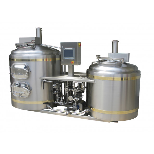 B-TECH III brouwhuis Na de succesvolle introductie van de B-TECH brouwunits lanceert Brouwland de B-TECH III. Deze “grotere broer” met 5 hl brouwcapaciteit laat, dankzij de 3 ketels, 2 brouwsels per dag toe ! Door de gebruiksvriendelijke touch screen en PLC-sturing is professioneel brouwen nu ook voor artisanale brouwerijen toegankelijk en dit met een strak design aan een onklopbare prijs. Beslagketel: Verticale cilindervormige geïsoleerde ketel met verwarmingsgedeelte onderaan en in de wand. Volledig RVS AISI 304. Volume: 650 liter. diameter: 1150 mm hoogte: 1800 mm Met mangat bovenaan. Verwarming met elektrische verwarmingselementen van 30 kW, met circulatiepomp voor verwarming van water, veiligheidsklep en expansievat. Variabele toerentalregeling voor menger. Met hopfilter (voor beslagketel). Aansluitspanning: 400 V, 3 N, 50 Hz, 31 kW. Filterkuip + whirlpool: Vertikaal opgesteld, cilindervormig, geïsoleerd vat zonder verwarmingsgedeelte. Volledig RVS AISI 304. Naast het mangat bovenaan ook een extra mangat aan de zijkant. Volume: – Filterkuip: 600 liter – Whirlpool: 600 liter Afmetingen: – diameter: 1280 mm – hoogte tot bovenste mangat: +- 1600 mm. Met messen voor het snijden van filterbed. Aansluitpijpleidingen tussen beslagketel en filterkuip/whirlpool: vleugelrad pomp. Peilglas. RVS platenwarmtewisselaar. Waterkoelbuis voor monsterneming. Inline wortfilter.   Totale afmetingen: H 2110 x B 3115 x D 1380 mm Contacteer onze technische dienst voor meer opties.
