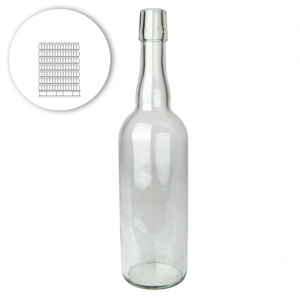 Hoogkwalitatieve, herbruikbare beugelflessen, wit. sluiting niet inbegrepen, zie accessoires inhoud 75 cl gewicht 0,585 kg hoogte 31 cm breedte 7,5 cm 1421 stuks pallet 7 lagen x 203 stuks Opgelet: palletten en tussenschotten worden niet retour genomen.