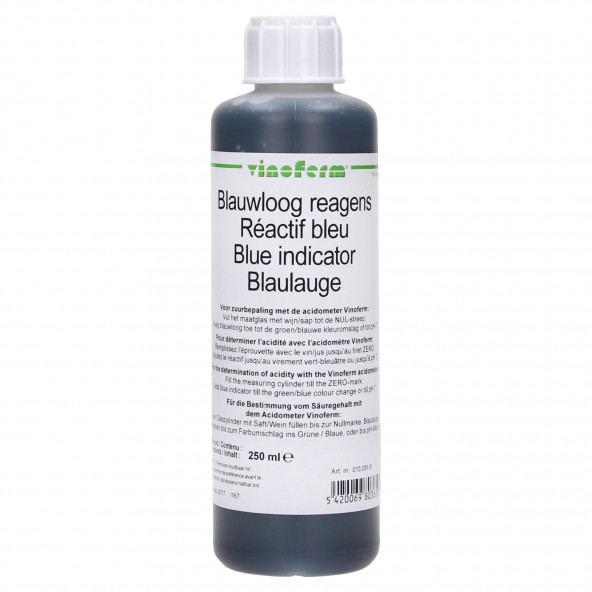 Reagens voor de zuurbepaling met de acidometer Vinoferm. Gegarandeerde kwaliteit !   Kan ik in plaats van de zuurgraad van mijn most de pH meten? Neen! De zuurgraad bij het wijnmaken is de weergave van het aantal grammen zuur in uw wijn/sap, meestal uitgedrukt in grammen wijnsteenzuur per liter. Dit kan enkel gemeten worden met blauwloog. Wat is pH? pH is het meten van de concentratie aan vrije waterstofionen in een vloeistof. De pH van zuiver water is 7. Vloeistoffen die een grotere concentratie hebben van waterstofionen dan zuiver water zijn zuur en hebben een pH-waarde van minder dan 7. Omgekeerd, vloeistoffen met een lagere concentratie waterstofionen zijn basisch en hebben een pH-waarde die groter is dan 7. De pH-schaal loopt van 1 tot 14. Je kan wel een pH-meter gebruiken in combinatie met blauwloog: in plaats van blauwloog toe te voegen tot kleuromslag blauw, voeg je blauwloog toe tot pH 7.00. Deze methode is nauwkeuriger en o.a. voor rode sappen veel beter af te lezen! De combinatie pH-meter, blauwloog en automatische buret is een professionele opstelling om nauwkeurig de zuurgraad te meten.