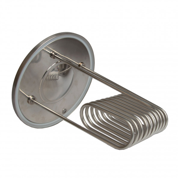 Witte rook! Het klooster heeft namelijk groot nieuws voor zijn dierbare Brew Monk adepten en parochianen. Vader abt en zijn apostelen stellen met gepaste trots hun 30 l vergistingsvat voor, waarin iedere zichzelf respecterende brouwer zijn brouwsel kan laten uitgroeien tot een wonderlijke godendrank. Om de brouwsels nog beter te beheersen tijdens hun vergisting en lagering, kan het vergistingsvat uitgerust worden met dit optioneel deksel met ingebouwde spiraalkoeler. Op die manier kan je heel eenvoudig en doeltreffend de temperatuur controleren in je geliefde vat. Via de 2 1/2″ mannelijke aansluitingen kan je gemakkelijk een toe- of afvoer voor water koppelen. AISI 304 deksel uitgerust met 2 x 1/2″ mannelijke aansluitingen inclusief 30 cm thermowell voor temperatuursensor inclusief 4,7 m rvs spiraalkoeler gat voor waterslot