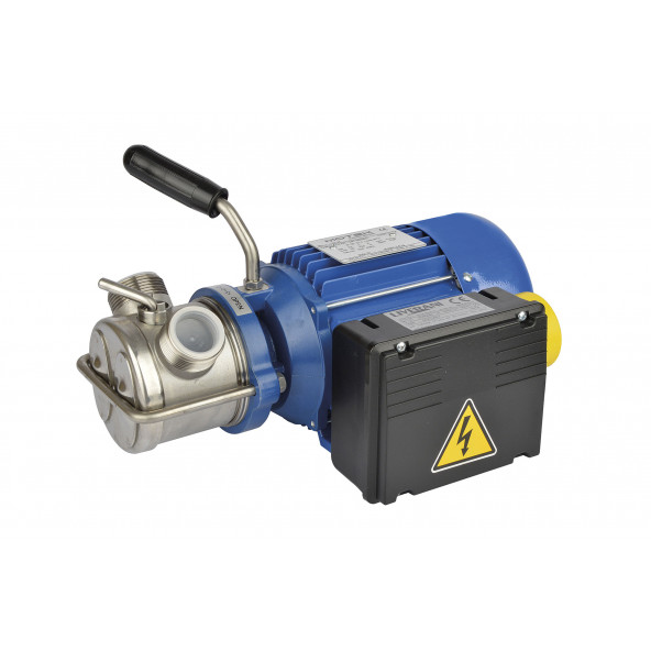 Pomp met zware elektromotor en interne bypass voor traploze debiet-regeling! motor 0.6 pk max. debiet: 58 l/ min max. druk: 2 bar aansluitingen: 1″1/4 x 25 mm Uiterst geschikt voor het verpompen van heldere voedingsvloeistoffen (max. dichtheid 1,1kg/l) Werking tot op een temperatuur van 100°C Met mechanische Viton dichting Links – en rechtsdraaiend Pomphuis en vleugelrad in inox AISI316-uitvoering Voeding : 220V~ , 380V~ of zelfs 12V- of 24V- Verkrijgbaar met by-pass Monteerbaar op apart te voorziene kar Niet geschikt voor benzines en oplosmiddelen. Pomp niet laten droogdraaien, maar eerst opgieten met vloeistof, daarna werkt de pomp zelfaanzuigend.