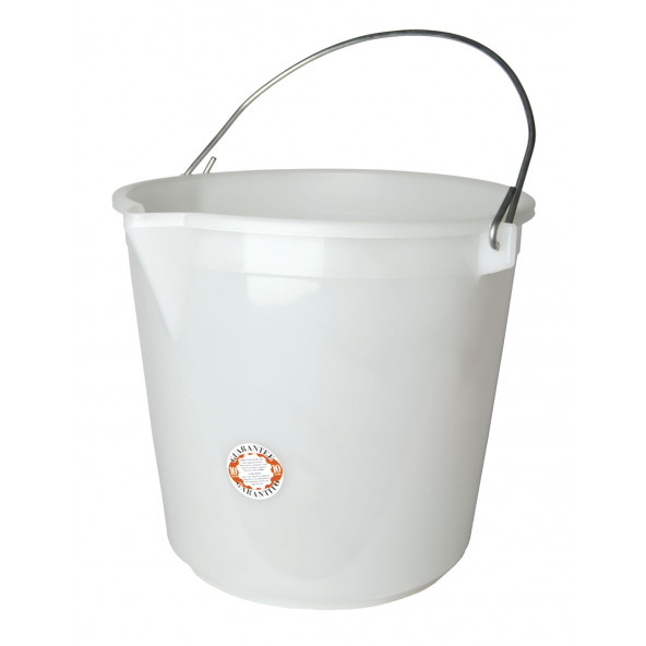 Emmer 25 l in wit plastic, gegradueerd, met schenktuit. Zonder deksel.
