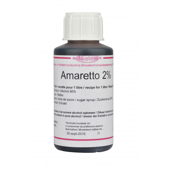De gebruikshoeveelheid bij likeurbereiding wordt aangeduid in procent: vb. 1% = 1 liter extract voor 100 liter likeur. Voor het bijsmaken van wijn of bier zijn deze hoeveelheden niet van toepassing. Ieder flesje is voorzien van een likeur-recept. Mag niet in commerciële wijnen gebruikt worden! Zelf suikersiroop 65% maken is heel eenvoudig: 1,05 kg kristalsuiker oplossen in 1 l water geeft 1,66 liter suikersiroop van 65% 633 gr kristalsuiker oplossen in 600 ml water geeft 1 liter suikersiroop van 65% Steeds goed roeren tot de suiker volledig is opgelost. Amaretto 2% 100 ml extract is voldoende voor 5 liter likeur 1 l extract is voldoende voor 50 liter likeur