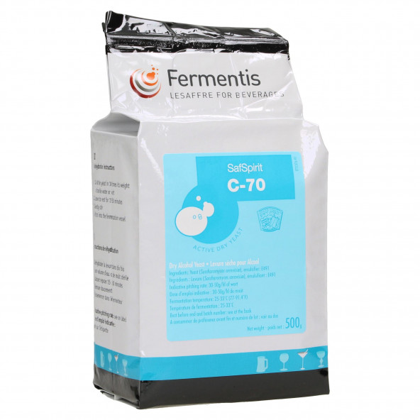 SafSpirit C-70 is met zijn robuuste, multifunctionele stam, de favoriete gist van distilleerders. De gist produceert alcohol van een hoge kwaliteit uit alle soorten extracten. Saccharomyces cerevisiae produceert alcohol van hoge kwaliteit ideale vergistingstemperatuur: 25-33°C dosis: 30-50 g/hl