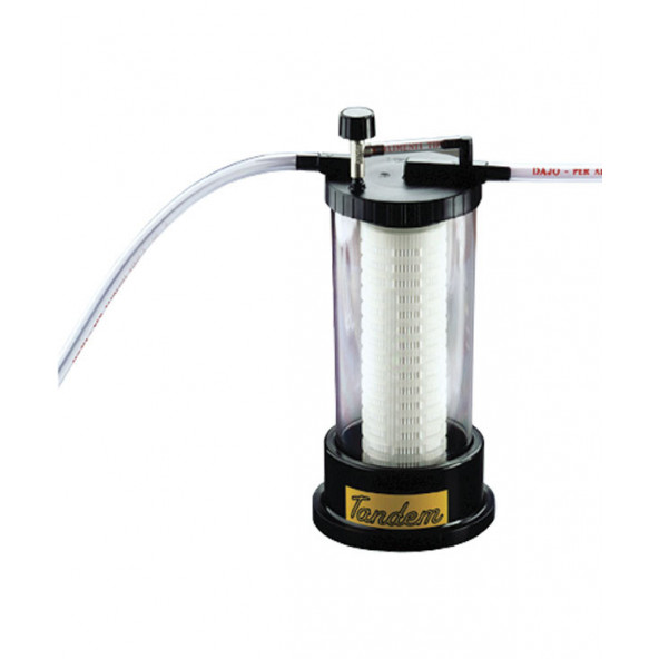 Speciaal voor het vacuum bottelapparaat (018.065.3). Filter met uitspoelbare filterpatronen! Door aansluiting aan het vacuum-bottelapparaat is filtreren en bottelen / hevelen tegelijk mogelijk ! Filterhuis zonder filterpatroon geleverd.- NIET drukbestendig, – NIET bruikbaar met een elektropomp.