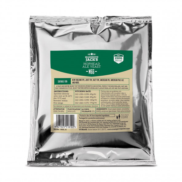 M66 Hophead Ale Yeast is een gist- en enzymmengsel dat is ontworpen om een prominent hoppig en fruitig profiel te bevorderen. Perfect voor eigentijdse IPA’s van New England- tot West Coast-stijlen. Aromakenmerken Het dry hop-karakter en het aroma van eventuele fruittoevoegingen tijdens de gisting worden benadrukt. Het gematigde, evenwichtige esterprofiel van deze gist zal het karakter van New World hop zeer goed aanvullen en tegelijkertijd wat moutkarakter naar boven halen. Smaak-/mondgevoelkenmerken Deze gist vergist zuiver en relatief neutraal met een gematigd, evenwichtig esterprofiel dat subtiele complexiteit toevoegt. Bieren die met deze gist zijn gefermenteerd, hebben een gematigd droge afdronk, maar behouden een goed mondgevoel om zo de perceptie van een dun mondgevoel te voorkomen. Bieren met een hoog alcoholgehalte Met een goede alcoholtolerantie tot 10%, werkt deze gist bijzonder goed in sterkere IPA-stijlen. Bieren met een hoger alcoholgehalte behouden een goede body zonder al te zwaar te zijn.