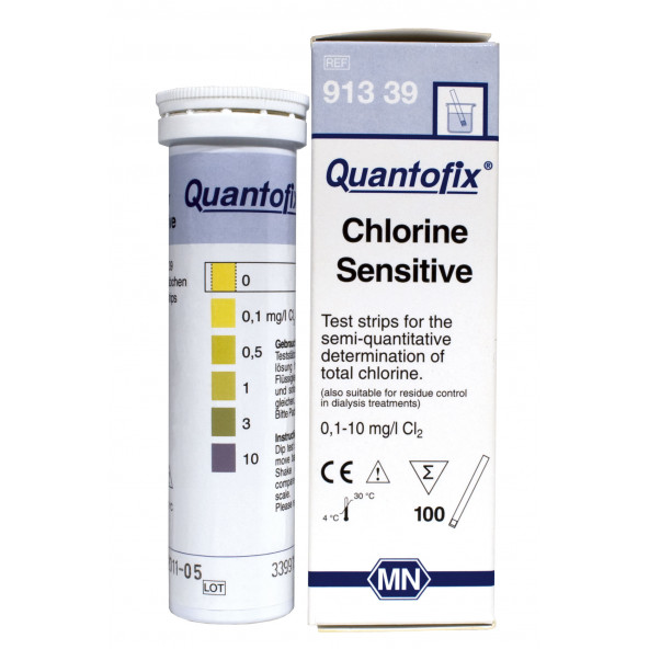 Quantofix® chloor 0 – 1 mg 100 teststaafjesQuantofix® Sensitive Chloor zijn teststaafjes voor een semi-kwantitatieve bepaling van het totale chloor in oplossingen. Ze kunnen o.a. gebruikt worden om de chloorconcentratie van de asepto-oplossing te meten voor en na het reinigen. Eenvoudig in gebruik: Teststaafje 1 seconde in de testoplossing houden De overtollige vloeistof eraf schudden 15 seconden wachten Het testveld vergelijken met de kleurenschaal Meetbereik: 0,1-10 mg/l Cl2