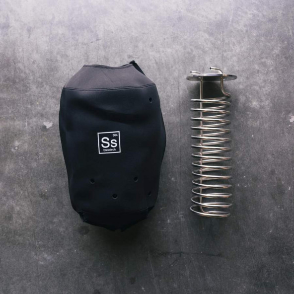 Dikke neopreenmantel van 5 mm met rits Dompelkoelerspiraal gemonteerd op 6″ TC-dop 3/8″ slangtuiten op de koelerspiraal Meegeleverde slangklemmen (voor koelspiraal)