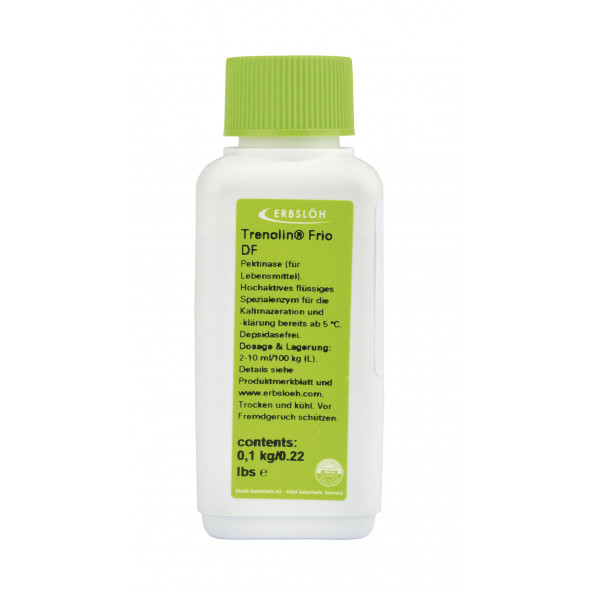 Hooggeconcentreerd en uiterst actief vloeibaar pectinase, speciaal ontwikkeld voor de koud-maceratie van vruchtensappen/mosten. Werkt reeds vanaf 5 °C! Zeer snelle werking: 100% pectineafbraak in 75 min. bij 8 °C! Verbetert de persbaarheid van pectinerijke vruchten aanzienlijk, ondersteunt de kleurextractie bij maceration-carbonique en pulpgisting, versnelt de most-voorklaring. Richtdosering: 2-4 ml/100 kg bij een temp. van 10°C en reactietijd van 1-2 uur.