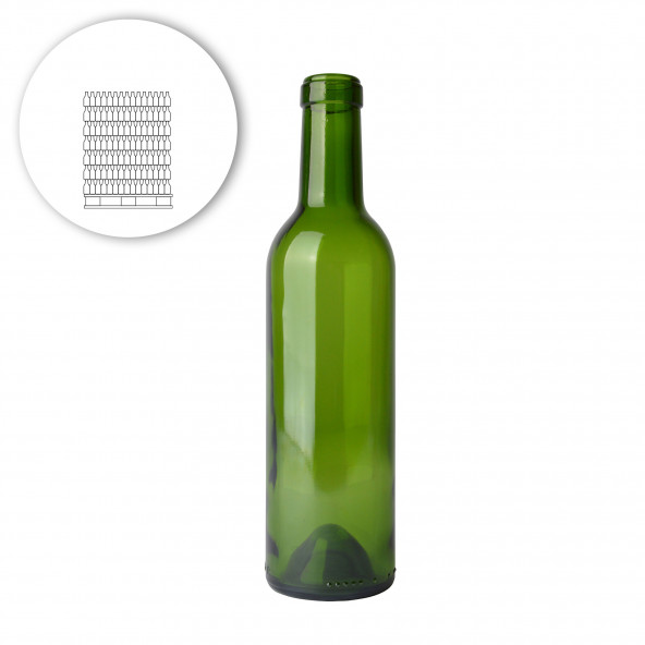 Hoogkwalitatieve, herbruikbare bordeaux flessen. sluiting met kurk (niet inbegrepen, zie accessoires) inhoud 37,5 cl gewicht 0,312 kg hoogte 24,2 cm breedte 6 cm 2380 stuks pallet 7 lagen x 340 stuks Opgelet: palletten en tussenschotten worden niet retour genomen.