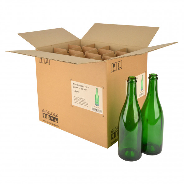 Robuuste kartonnen flessendoos met 12 Champagne flessen van 75 cl. De vakverdeling in de doos beschermt de flessen tegen glasbreuk. Gebruik deze handige doos ook om jouw ambachtelijke creaties te stockeren. stapelbare doos herbruikbaar en recyclebaar minder kans op glasbreuk, dankzij vakverdeling met handvaten voor gebruiksgemak palletinfo: 8 dozen per laag, 40 dozen (480 flessen) per pallet Sluiting fles (niet inbegrepen): zie accessoires. Zeer praktisch te gebruiken in combinatie met de FastRack (niet inbegrepen), zie collagefoto voor meer info. Opgelet: palletten en tussenschotten worden niet retour genomen. Afmetingen en gewicht per fles: Gewicht 0,752 kg Hoogte 30,4 cm Breedte 8,4 cm